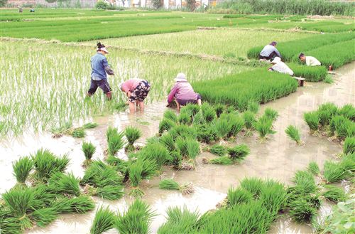 麦收结束后,农民们抢农时、忙插秧,绿油油的稻苗,映衬着农民忙碌的身影,构成一幅生态美图。(孙井贤 陈艳 徐雪林)