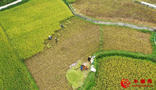 8月9日,在广西三江侗族自治县良口乡南寨村,村民在收割早稻(无人机照片)。 立秋过后,广西三江侗族自治县种植的早稻进入丰收季节,人们抢抓农时收割早稻。 新华社发(梁克川 摄)