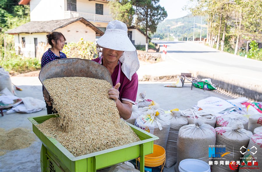 农民将晾晒好的稻谷进行机器筛选,打包入仓。新华网发(甘昊旻 摄)