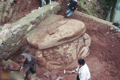 元旦期间,宜宾高县趱滩小学宿舍进行拓建工程,挖掘机在挖观赏水池时,挖到两块大型石块,外形奇特酷似蟾蜍和螃蟹。附近居民表示不清楚早前这里为什么会修建这两个石雕。