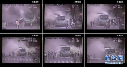 2014年7月6日,在新闻发布会现场公布的交警监控拍摄到的杭州“7·5”公交车放火案的监控画面(拼版照片)。新华社记者 鞠焕宗 摄