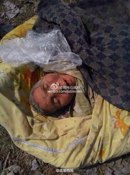 江苏邳州一老人被扔到野外等死,照片拍摄地在邳城镇泇口村。知情人称该老妇几天前被扔出,眼看着就这样被扔在林里,奄奄一息。经成都商报记者调查核实,邳城镇派出所工作人员称确有此事,已经解决。然而具体何事、如何解决,却不愿透露。