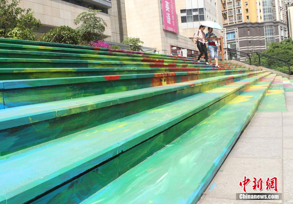 4月16日,重庆杨家坪步行街上现3D涂鸦楼梯,美轮美奂。图为市民走在3D涂鸦阶梯上。周毅 摄