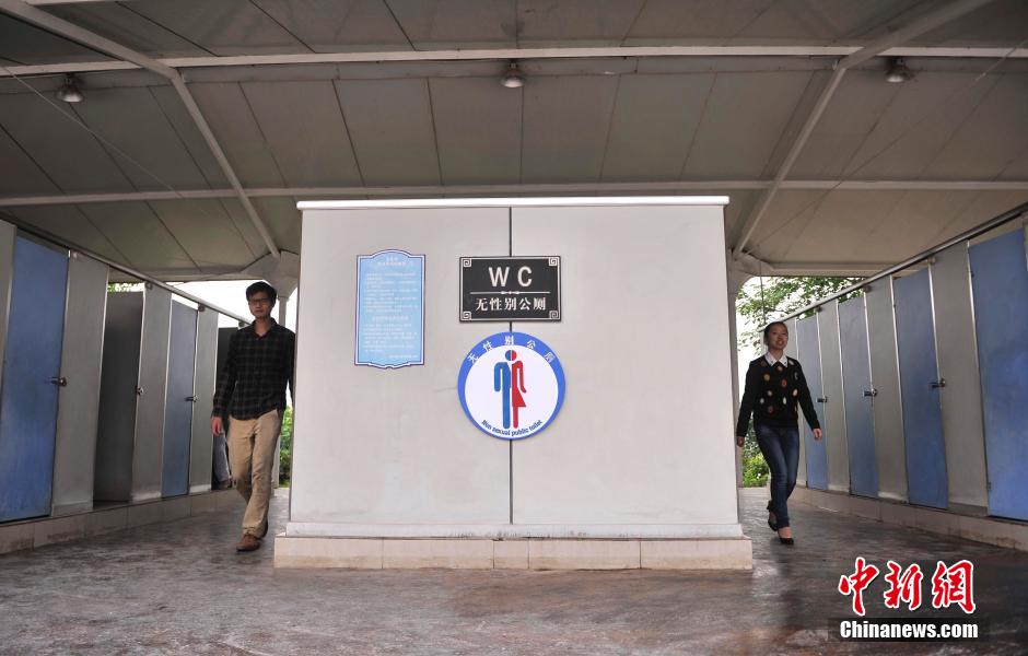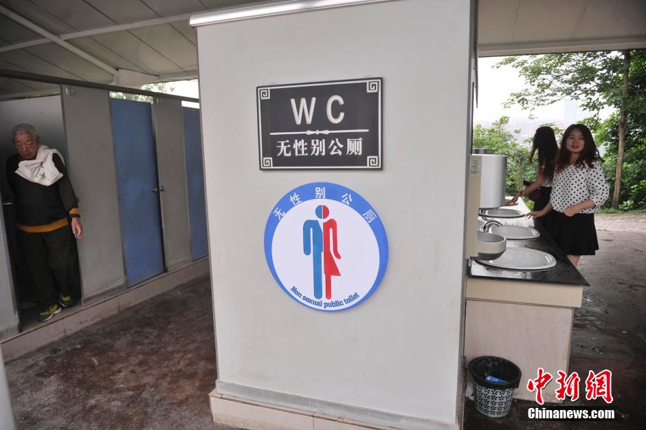 4月24日,重庆洋人街工作人员在公共厕所上挂起“无性别公厕”标识牌。公厕门外有一个醒目红色报警灯,当厕所有人时,该警报灯就会一直闪亮。据洋人街物管介绍,节假日游客众多,男厕经常出现空荡荡,而女厕排起了长龙,希望以这种设计方式能提高公厕的服务水平和利用效率。陈超 摄