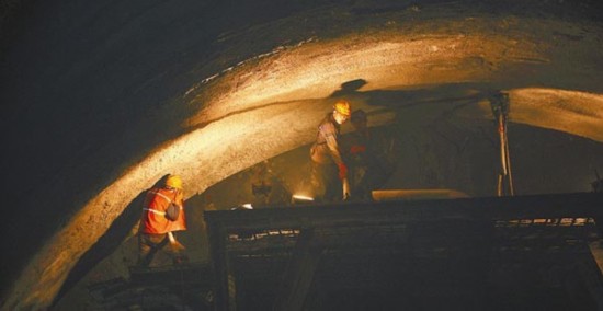 5月14日,在成兰铁路安县高川段跃龙门隧道,施工现场机器轰鸣。由于岩石非常坚硬,隧道掘进非常困难。作为我国铁路规划网“五纵五横”的一段,成兰铁路从成都向北延伸至在建兰渝铁路的哈达铺站,设计时速200公里,预计2018年2月建成。图为施工人员正在掘进隧道。本报记者 邹俊川 摄