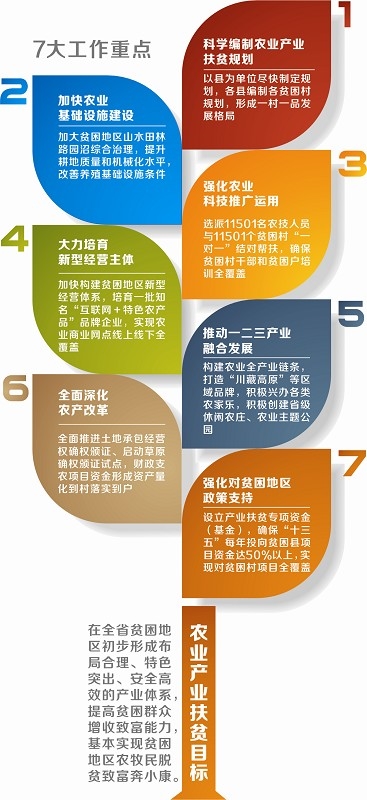 重点瞄准四大片区88个县,对265.45万有劳动能力的贫困人口进行重点扶持,7个方面构建贫困地区增收产业体系
