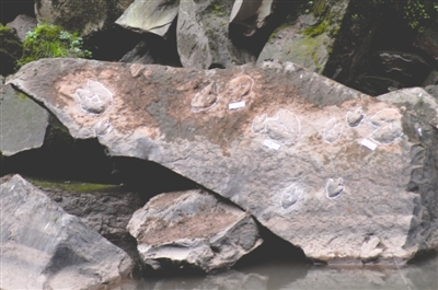 2015年秋天,桂花河汛期过后,徐挺来到河畔足迹点进行查看。徐挺介绍,自己先查看了几处比较常规的恐龙足迹,随后在一处落石上发现了好几个有些奇怪的脚印,最大的一个长度超过25厘米。“这些足迹呈椭圆形,有两个尖尖的脚趾,感觉有点像牛羊等偶蹄类动物踩下的。”徐挺说。