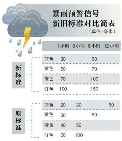 据悉,为使北京的暴雨预警信号发布更加适应逐渐提升的强降雨防范应对能力,北京市气象局于2015年8月启动对暴雨预警信号标准的修订工作。在完成面向市应急办、市防汛办等全市14家联动单位征求意见后,暴雨预警信号新标准目前已投入应用。