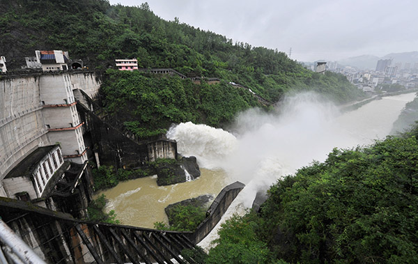 6月25日,湖北省宣恩县龙洞水库错峰泄洪,减小水库洪水对贡水河河道排洪的压力。