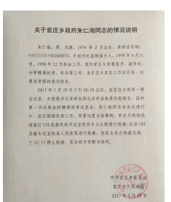 根据照片显示的文件内容称:2017年5月29日下午18:50分左右,在(河南开封杞县)官庄乡政府一楼会议室,乡党委书记宋祥永同志召开由各责任组长、驻村第一书记参加的精准扶贫攻坚会,朱仁海同志在会议进行中,因长期超负荷工作、劳累过度当场晕倒。文件透露,官庄乡政府迅速拨打120急救电话,并将朱仁海送至官庄乡卫生院进行抢救,后由120急救车送至杞县人民医院进行抢救。经医生全力抢救无效,朱仁海于22:15分停止抢救,医生初步诊断为猝死。