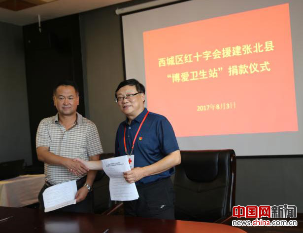 为贯彻落实中央精准扶贫要求,推动京津冀一体化协同发展,8月3日,北京市西城区红十字会对口支援张家口工作考察团一行,赴张家口市、张北县、小二台镇等地考察,并向张北县小二台镇、张北县台路沟乡各捐赠10万元善款,用于援建两个乡镇的“红十字博爱卫生站”。