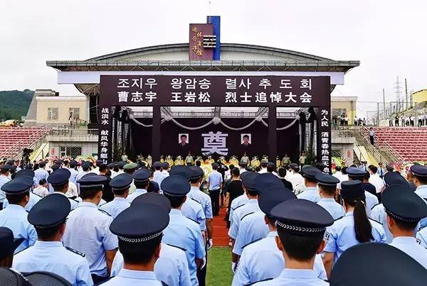 8月9日上午10时30分,追悼大会在安图县体育场隆重举行。会场中央祭奠台上方,并排悬挂着抗洪英雄曹志宇、王岩松的大幅遗像。两位烈士的骨灰盒上覆盖着鲜红的党旗,安放在素菊和翠柏丛中。“战洪水,献风华身躯山河动容;为人民,洒青春热血天地同悲”、“抗洪英雄永垂不朽,人民卫士浩气长存”、“抗击洪魔英雄无畏垂千古,心系百姓壮士柔情动天地”……,祭奠台两侧及会场周围悬挂的一幅幅挽联,饱含着对两名年轻民警誓死保护群众生命财产安全的崇高敬意,饱含着对英雄逝去的无尽思念和痛惜。在低徊的哀乐声中,全场人员肃立脱帽,向烈士鞠躬默哀,眼含热泪向烈士作最后的告别。