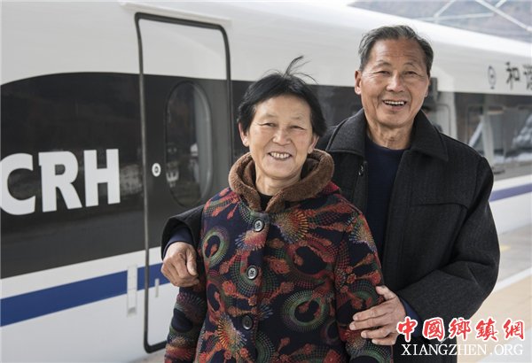 从未坐过任何火车、家住秦岭腹地的陕西省佛坪县东岳殿村六组73岁的叶明吉和妻子专门赶到佛坪高铁站,与模拟运行的CRH3A型动车组列车合影留念(11月25日摄)。新华社记者 陶明 摄