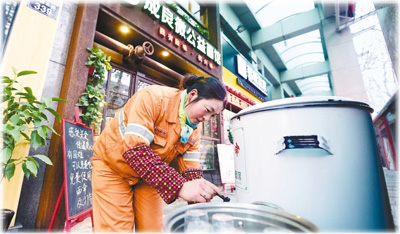 环卫工人正在杭州一家面馆门口取饮免费热茶水。 |