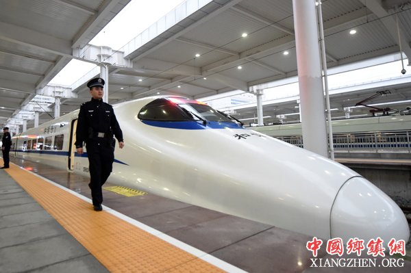 12月6日,一名铁路民警从重庆北至西安北首发列车旁走过。