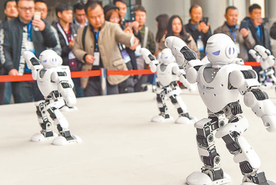 12月6日至8日,“2017世界智能制造大会”在南京举行,一批智能制造的最新应用,让以往给人“坚硬”印象的制造业,发生了巨大变化。在智能浪潮带动下,中国制造业正稳步创新、转型、升级。图为智能机器人在展示区进行舞蹈表演。