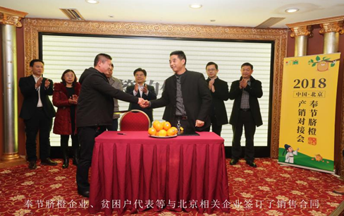 本网讯(记者刘家琴)2018年1月8日,由重庆市奉节县人民政府和《中国扶贫》杂志社联合举办的“‘南国嘉果’——奉节脐橙来袭京城”活动在重庆市驻京办举行。重庆市奉节县人民政府副县长张迁率领县扶贫办主任向城钢、县脐橙产业发展中心主任肖功勋等现场推广奉节脐橙。北京重庆企业商会会长谭传荣等出席了会议。奉节脐橙企业、贫困户代表等与北京相关企业签订了销售合同。