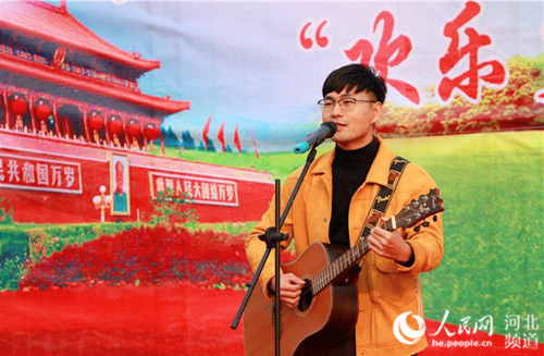 图为邯郸市峰峰矿区大峪镇大学生村官苏智演唱自己创作的歌曲《十九大的暖风吹啊吹》,表达了他“把青春献给基层”的满腔热情,引起众多青年的共鸣。陈思危 摄