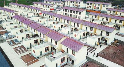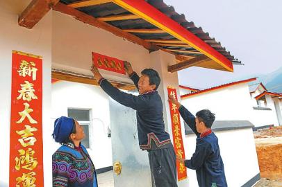 1月10日,昭觉县普诗乡杉树村建档立卡贫困户吉木约日一家,正在新居门前张贴对联。该村50户178名建卡贫困人口全部搬进宽敞明亮的彝家新寨。