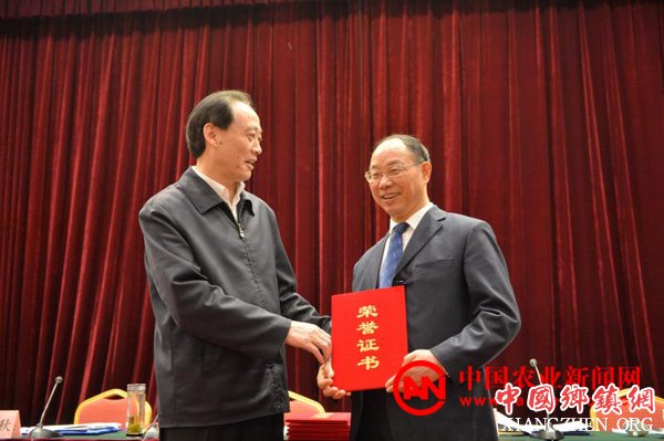 余欣荣副部长为北京市农林科学院玉米研究中心主任赵久然颁发证书。本网记者 叶晓宁 摄