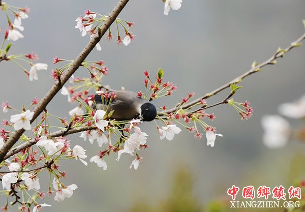 3月21日,在湖南张家界武陵源黄龙洞景区,一只小鸟在花间采食。新华社发(吴勇兵 摄)