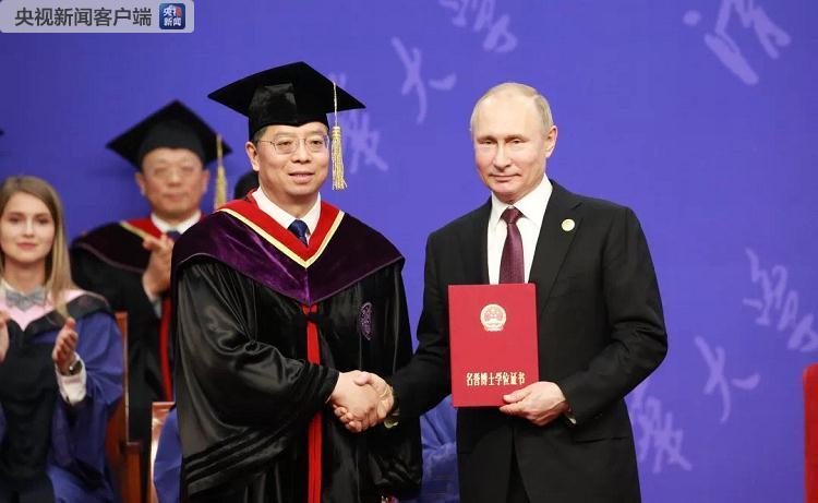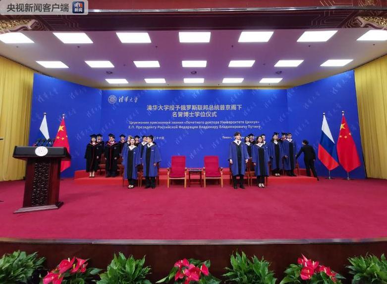 在习近平主席见证下,清华大学校长邱勇向普京总统颁发了名誉博士证书。普京在接受证书时说:清华大学是举世闻名的大学,也是习近平主席的母校,培养了很多优秀人才。今天,在我的好朋友习近平主席见证下,清华大学向我授予名誉博士学位并举行隆重仪式,我感到很荣幸,也深受感动。