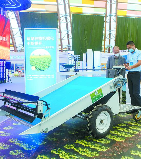 观众在展览上了解一款叶菜收获机