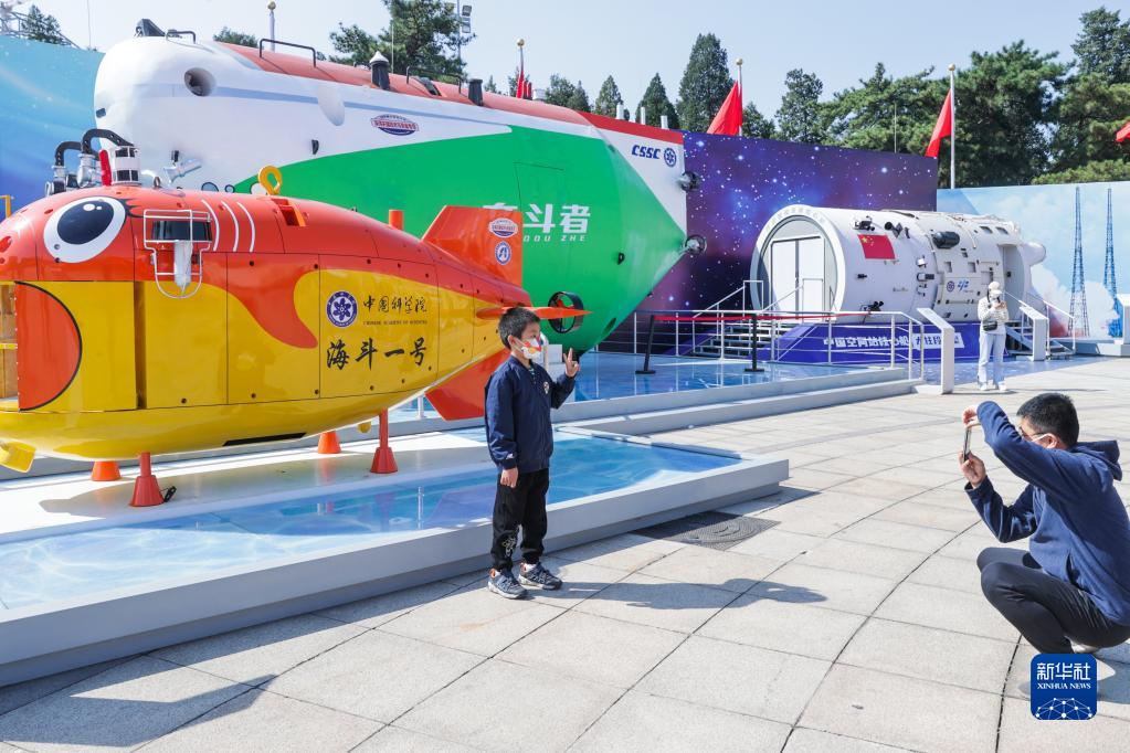 10月6日,参观者在“奋进新时代”主题成就展室外展区“海斗一号”潜水器模型前留影。新华社记者 张玉薇 摄