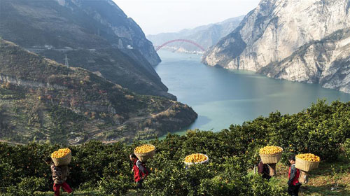 12月19日,湖北省秭归县屈原镇链子岩村村民在转运采摘的脐橙。 入冬以来,湖北省宜昌市秭归县进入脐橙收获旺季。近年来,该县积极推广脐橙无公害生态种植,加大品改力度,发展电商销售,使脐橙成为三峡移民重要的收入来源之一,有力地促进了当地移民脱贫增收。 新华社发(郑家裕 摄)