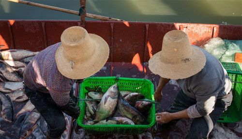 12月25日,在星云湖畔的老河咀鱼市,渔民将捕捞到的鱼搬运上岸。 当日,位于云南省玉溪市江川区的星云湖迎来一年一度的开湖捕鱼季,600余艘渔船驶入星云湖捕捞。 星云湖是云南省九大高原湖泊之一,本次开湖捕鱼时间将从2019年12月25日持续至2020年1月23日。 新华社记者 胡超 摄