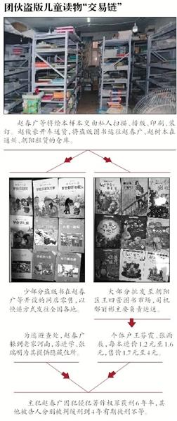 具体来说,赵春广等人将绘本样本交由私人扫描、排版,再发至指定的地下印刷厂、装订厂进行印刷、装订,最后将图书分别运往赵春广、赵树本在北京通州区、朝阳区租赁的仓库。