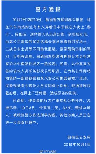通报称,10月7日12时10分,赣榆警方接到群众报警,称在汽车南站附近有多人穿着日本军服在大街上“游行”。接报后,巡特警大队迅速处警,到现场发现由某公司组织的10余名群众演员穿着新四军战士、二战日本士兵等不同角色服装,携带网购仿制的军刀、步枪等道具,由新四军扮演者押解日本兵扮演者沿华中南路往城区一路巡游。经查,以仲某某为首的该伙人员系某影视公司职员,在为其公司即将拍摄的一部微视频和某汽贸公司做营销推广活动,民警现场责令该伙人员立即停止活动。现场被网民截拍后,在网上广泛传播,造成恶劣的影响。