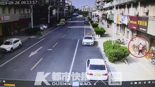 监控画面显示:9月28日9点13分,嫌疑人汪某某走出了受害人胡女士的店里,走到马路中间,汪某某将偷来的手机放到了口袋。