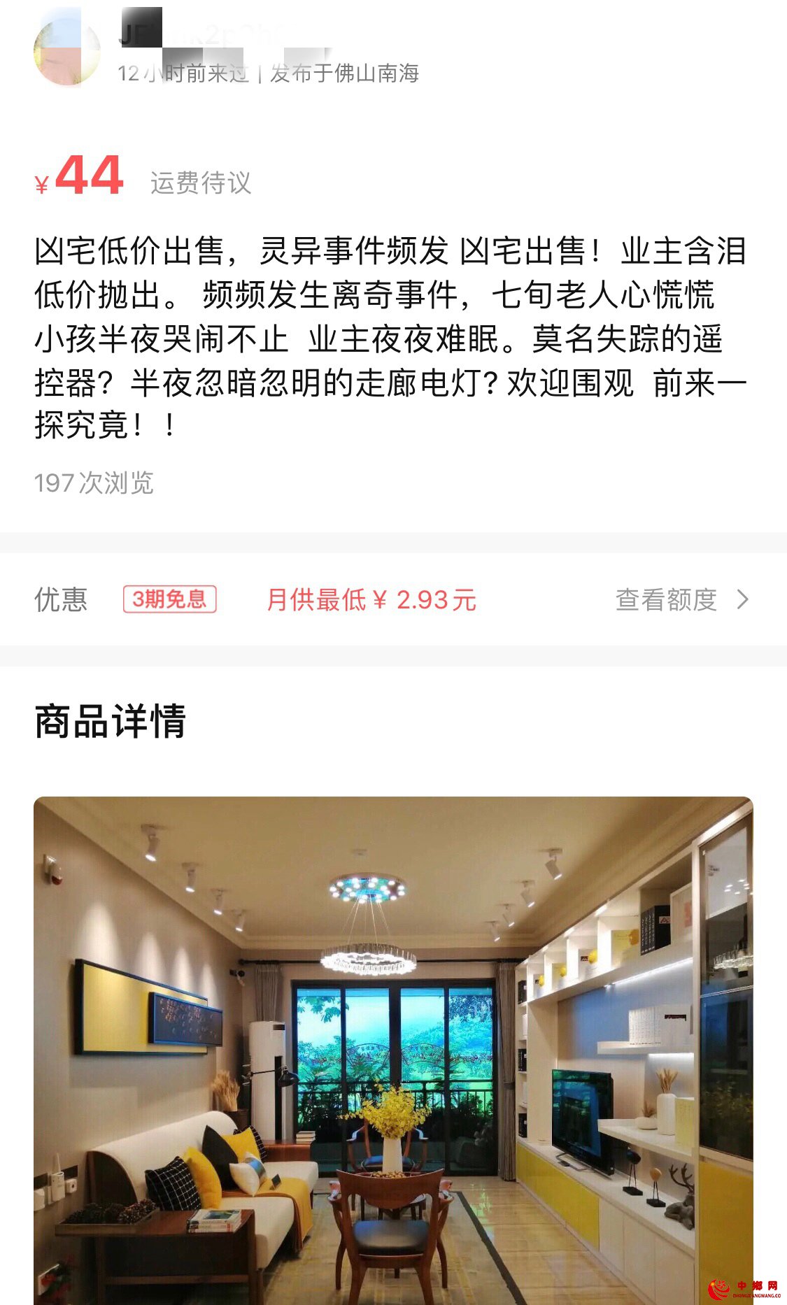 另一则出售信息描述更为惊悚,“凶宅低价出售,灵异事件频发,业主含泪低价抛出。七旬老人心慌慌,小孩半夜哭闹不止,业主夜夜难眠。莫名失踪的遥控器?半夜忽暗忽明的走廊电灯?欢迎围观,前来一探究竟!”