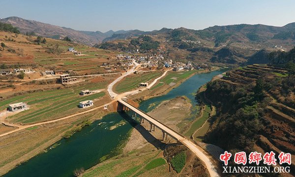 寻甸回族彝族自治县河口镇沙谷渡小村跨越牛栏江的桥梁和公路(2月20日摄)。