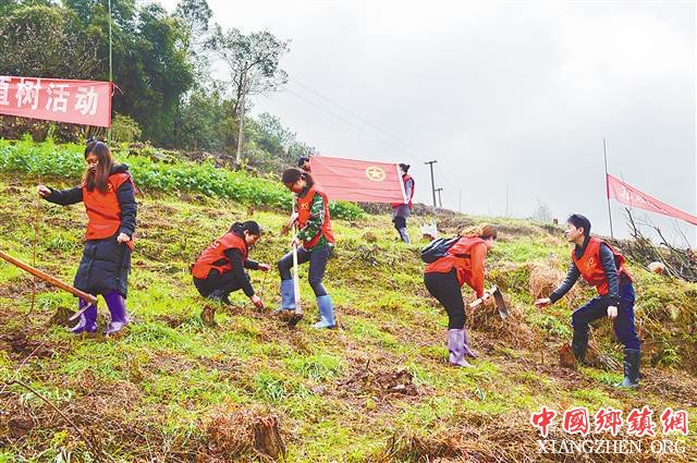 22日,在柳荫镇永兴村天眼洞的植树现场,一排排树苗被放在树坑旁,大家冒雨挥锹、扶苗浇水、夯土压实,三人一组分工合作,种下樱花、腊梅,一派热火朝天的景象。