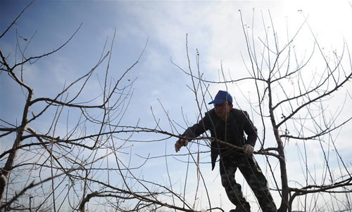 2月26日,延安市洛川县永乡镇冯家村果农在修剪苹果树树枝。 新华社发 (张博文 摄)