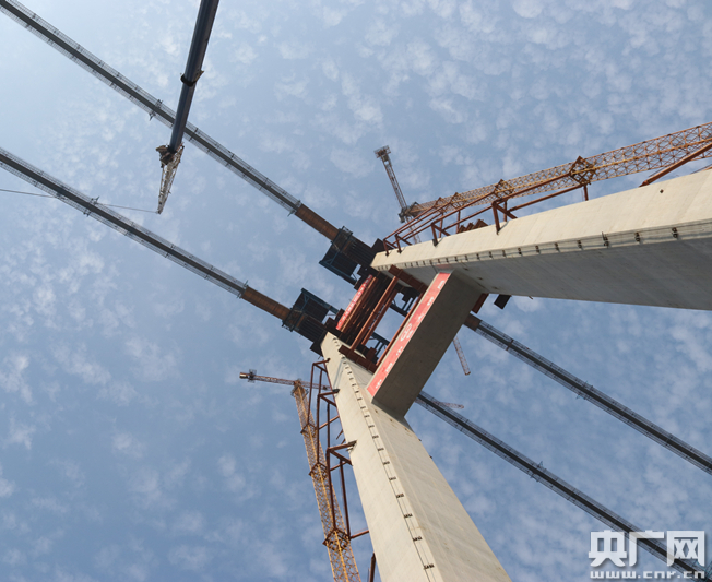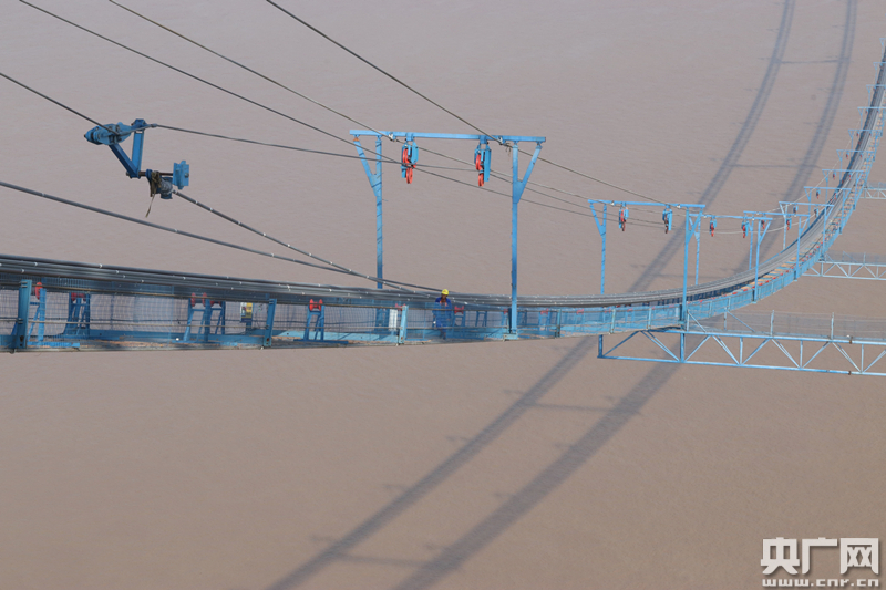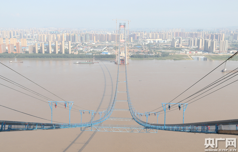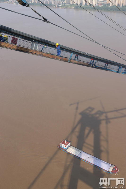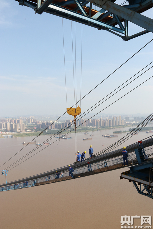 央广网武汉7月18日消息(记者黄炎秋 张卓 熊峰)位于湖北武汉的杨泗港长江大桥是一座双塔双层地锚式钢桁梁公路悬索桥,主跨1700米,一步跨越长江。建成后将成为世界上跨度最大的双层悬索桥。目前正值高温天气,工人们每天在200多米高的“云端”穿梭,在南北两岸的猫道上,完成主桥主缆架设和引桥承台、墩身、箱梁施工。