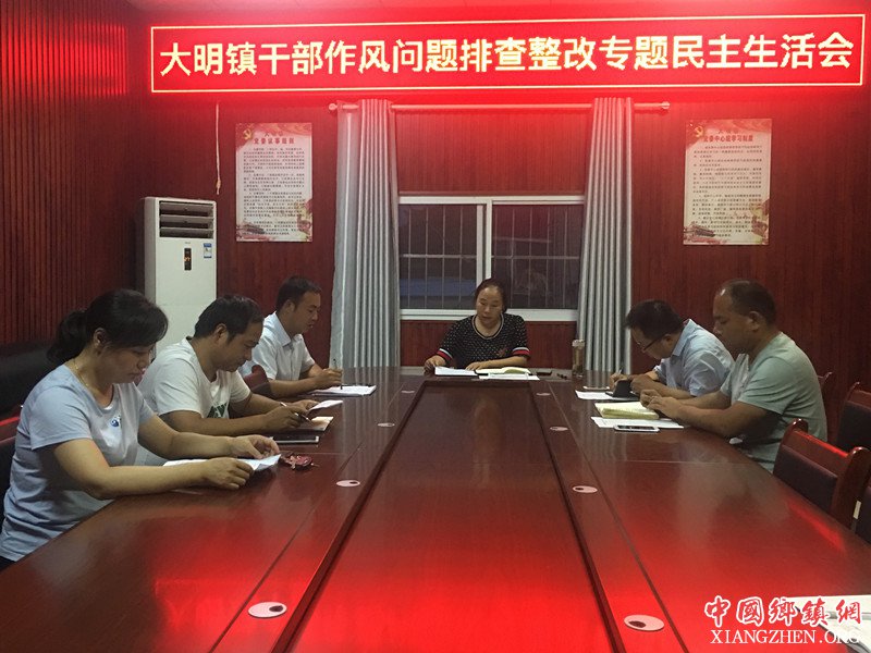 (中国乡镇网陕西讯)8月27日晚上,按照区委工作部署,大明镇领导班子召开干部作风排查整改专题民主生活会,会议从遵守政治纪律、慢作为不作为乱作为、“庸懒散慢虚”和“四风”隐形变异四个方面,通过四个小时认真查摆剖析,深学细悟、深谈细查、深思细照,开展批评与自我批评,推动整改落实。