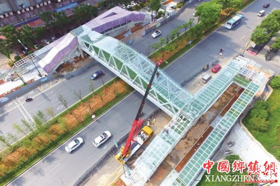 8月27日,长沙县星沙大道,施工人员在搭建人行天桥的玻璃雨棚。该天桥位于星沙大道与棠坡路交汇处,是长沙县跨度最长的一座天桥,主桥采用钢桁架结构,跨径40.8米。目前该桥整个工程已基本完成。三湘都市报·华声在线记者 田超 摄