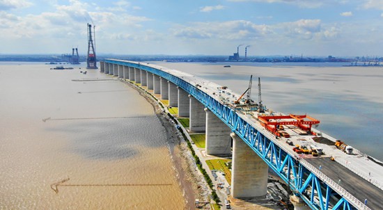 9月25日,沪通长江大桥桥面沥青摊铺现场(无人机拍摄)。当日,沪通长江大桥正式摊铺桥面沥青。沪通长江大桥连接江苏南通市和张家港市,主跨1092米,建成后将成为长三角地区沿海重要的铁路、公路过江通道。许丛军/摄(新华社发)