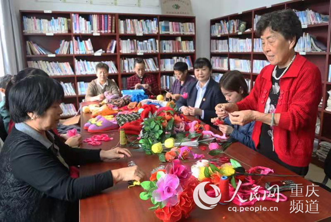 巴南龙洲湾街道沿河村手工制作业原党支部正在教党员制作绢花。巴南区委组织部供图