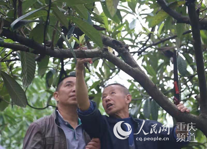 巴南区龙洲湾街道沿河村果树业原党支部高级农技师王泽荣正在一对一为党员讲解枇杷修枝技术。巴南区委组织部供图