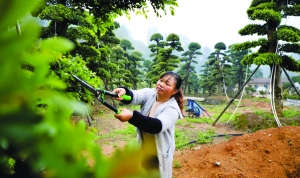 站街镇小河村宜信园林苗木生产基地内,工作人员正在修剪树枝。