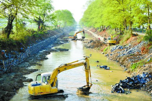 3月29日,双峰县荷叶镇清泉村,工人在修复损毁的河堤。去年长时间的降雨,使该县涓水河上游荷叶镇段河堤多处遭受不同程度的损毁。最近,该镇积极组织人员抢抓时机修复河堤,确保防汛安全。(李建新 彭书根 摄影报道)