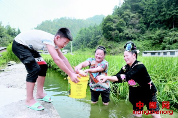 ▲村民为游客示范采摘葡萄。 ◥村民在捕捞稻田鲤鱼。