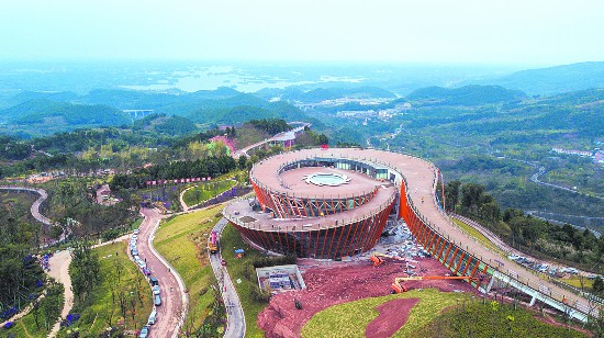 初秋的龙泉山层峦叠嶂,山林间的绿色渐渐变深,站在丹景山观景平台上,三岔湖在太阳的照耀下犹如调色板镶嵌在大地上。“城市之眼”雏形初现,俯瞰观景台,金沙文化太阳神鸟展翅欲飞,在这里可俯瞰东进区域,三岔湖、空港新城、天府国际机场等尽收眼底,未来这里将成为成都最好的观景台。据了解,目前丹景台景区核心区已基本建成,但部分收尾工作还未完工。