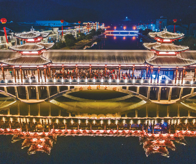 11月26日傍晚,浙江省温州市苍南县桥墩镇桥墩门大桥倒映水中,显现出迷人景色。当日,重建后的桥墩门大桥恢复通行。大桥始建于明弘治年间,曾多次遭水毁。此次群众自筹资金近900万元,在原桥墩的基础上,建成了一座长99米的仿古廊桥。