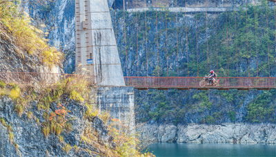为破解这一难题,当地政府在阿蓬江上建起了铁索桥,为群众出行提供便利。图为12月8日,大河口村村民骑摩托车通过铁索桥。