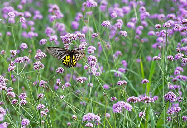 6月25日,蝴蝶在河南平顶山尧山花海鲜花丛中飞舞。